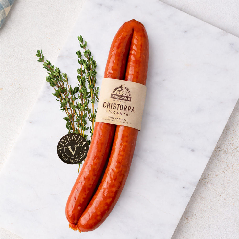Chistorra е тънка, дълга испанска наденица, приготвена по автентична рецепта от региона La Rioja. Създадена за готвене, тя предлага богат вкус на пушен червен пипер / Pimentón de la Vera/, с нежна текстура и сочност, запазена чрез внимателна сушилна обработка.